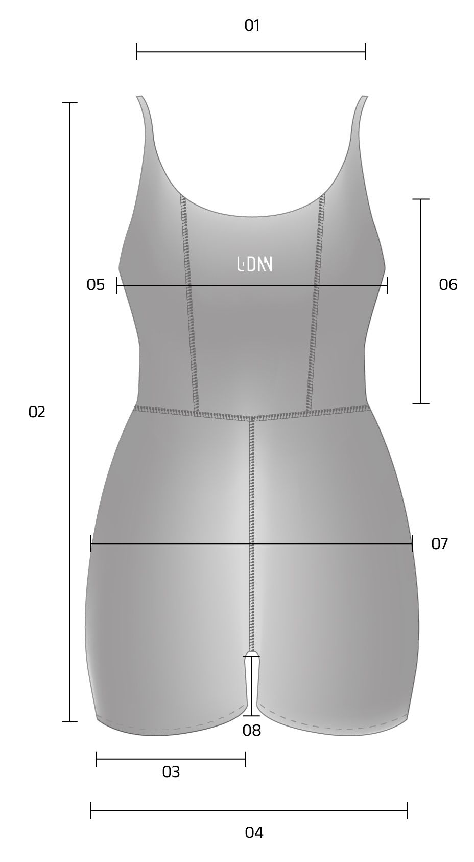 (1) Busto: 38cm (2) Compimento: 76cm (3) Perna: 27cm (4) Cintura: 34cm (6) Corpo: 24cm (7) Quadril: 42cm (8)Gancho: 16cm