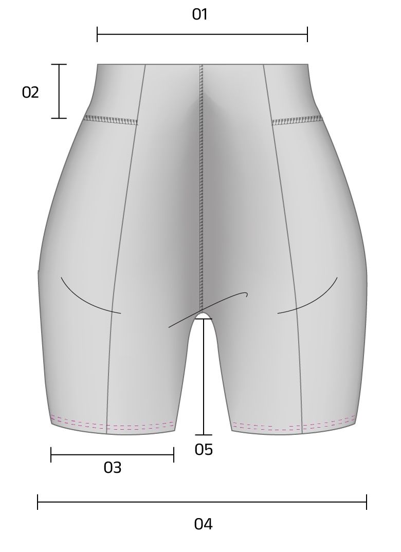 (1) Cintura: 31cm (2) Cós: 8cm (3) Perna: 27cm (4) Quadril: 44cm (5) Interno perna: 14cm