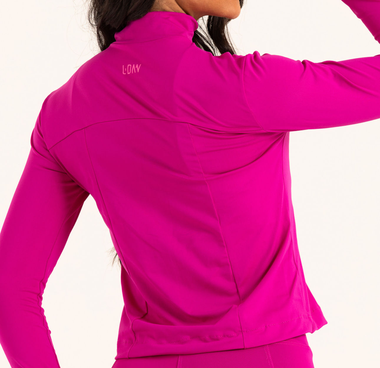 Jaqueta com fechamento em zíper tratorado frontal e gola alta.